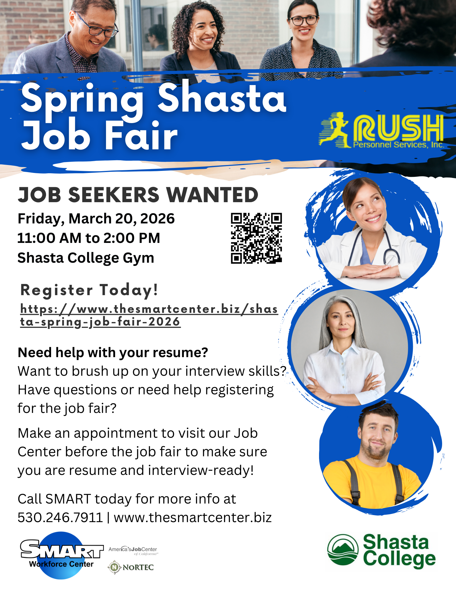 Don't miss out on this opportunity to connect with local employers and explore job opportunities in various industries. Register now to attend the SMART Workforce Center Spring Job Fair! We look forward to seeing you at Shasta College!